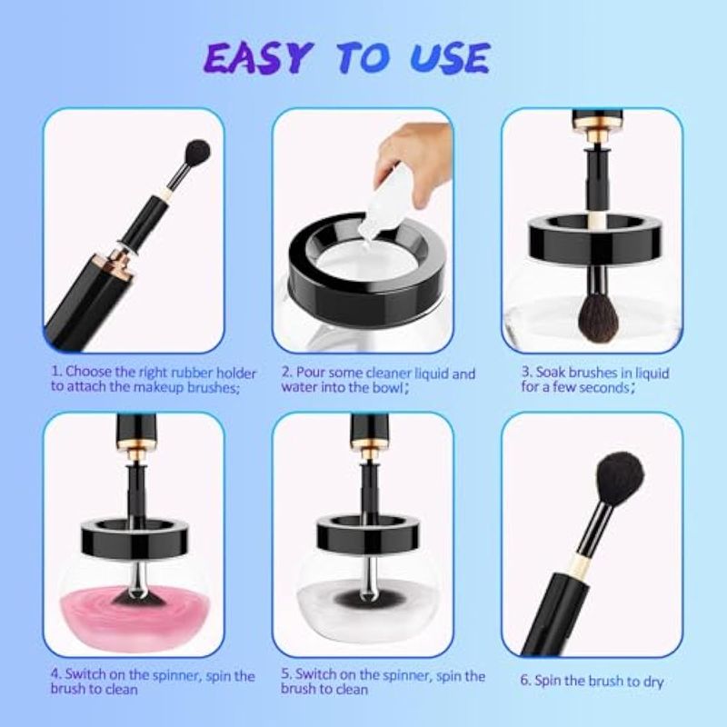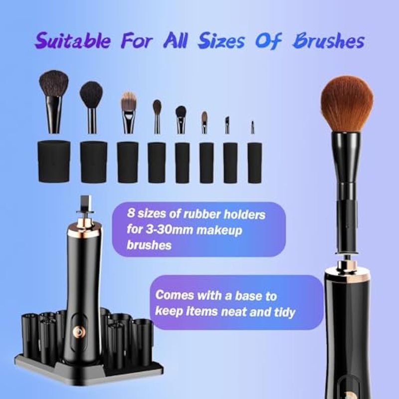 Adecuado para la mayoría de tamaños de pinceles: con 8 tamaños diferentes de soportes de goma flexibles, esta máquina limpiadora es compatible con el 95 de las brochas de maquillaje disponibles en el mercado. No importa el tamaño de tus cepillos, esta máquina puede manejarlos todos