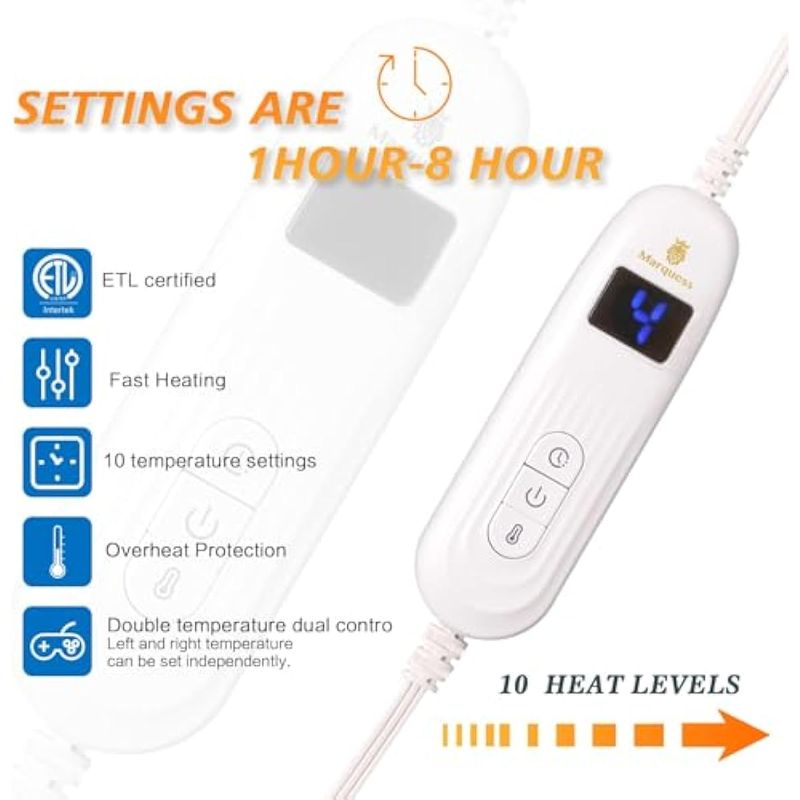 Fácil de usar: las mantas térmicas Marquess controlan la temperatura mediante el sistema de calefacción PTC+NTC, que es fácil de usar y puedes ajustar a tu nivel preferido de acuerdo a tu entorno. La pantalla brillante hace que sea fácil de ver por la noche. 10 ajustes de temperatura y 8 ajustes de tiempo, 89.6 ?-113?, protección contra sobrecalentamiento. Cuenta con alambre de calefacción mejorado que cubre más área de calefacción, esta función de calentamiento rápido puede ayudarte contra el clima frío y obtener una situación cómoda y cálida rápidamente.