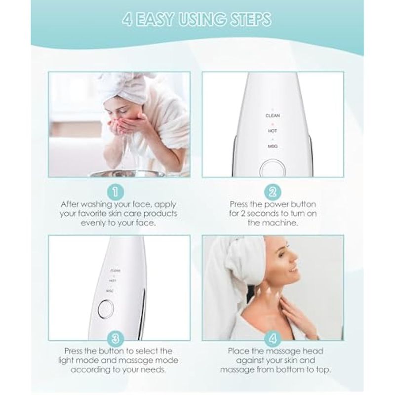 Cómo utilizar: Limpie la cara y aplique algunos productos para el cuidado de la piel antes de usar. Mantenga presionado el botón para encender y seleccione el modo que necesita. Sostenga los anillos de detección en ambos lados y coloque el sensor en su piel, el dispositivo comenzará a vibrar. Se recomienda usar una o dos veces al día durante cinco a diez minutos.
