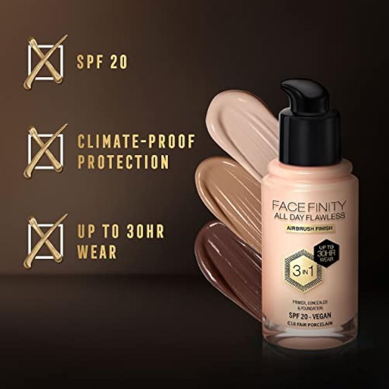 BELLEZA Y SALUDBELLEZA Y CUIDADO CORPORALMAQUILLAJEMax Factor Facefinity - Base líquida 3 en 1 todo el día, FPS 20-10, porcelana justa, 1.0 fl oz