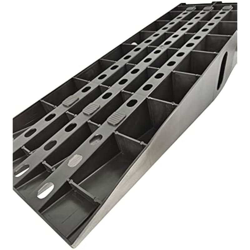 La seguridad es lo primero: coloque siempre las rampas sobre una superficie dura, lisa y nivelada. No utilizar en una superficie irregular, inclinada, suciedad, hierba, grava, arena o cualquier otra superficie suelta o inestable.
