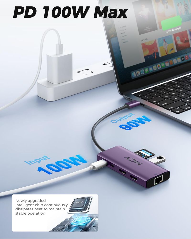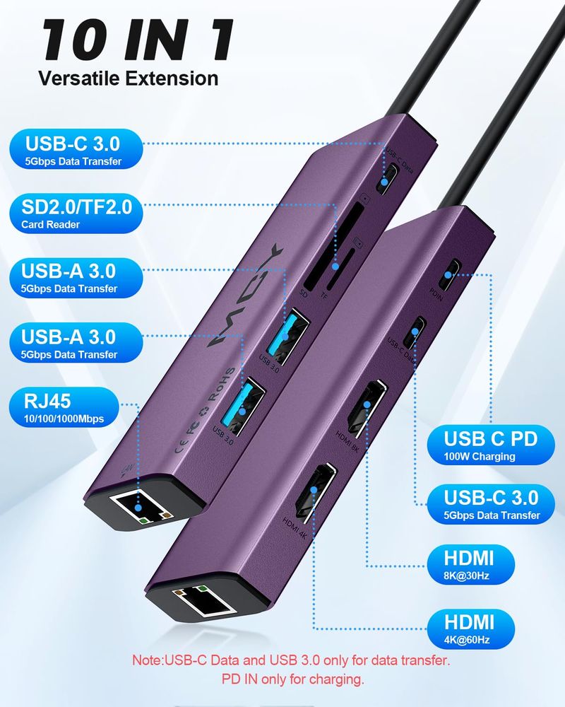 Estación de acoplamiento USB C 10 en 1: la base Thunderbolt MCY redefine la oficina eficiente, cuenta con 1 puerto HDMI1 - 8K, 1 HDMI2- 4K, 2 USB-A 3.0, 2 puertos de datos USB-C 5 Gbps + carga rápida de 100 W PD, lector de tarjetas SDTF, lo que lo convierte en una verdadera potencia Ethernet de concentrador USB. Nota: Antes de comprar el divisor usb-c, asegúrese de que el puerto C de su computadora admita la transmisión de audio y video y admita el modo Alt DP tales, USB 4.0Thunderbolt 3Thunderbolt 4.