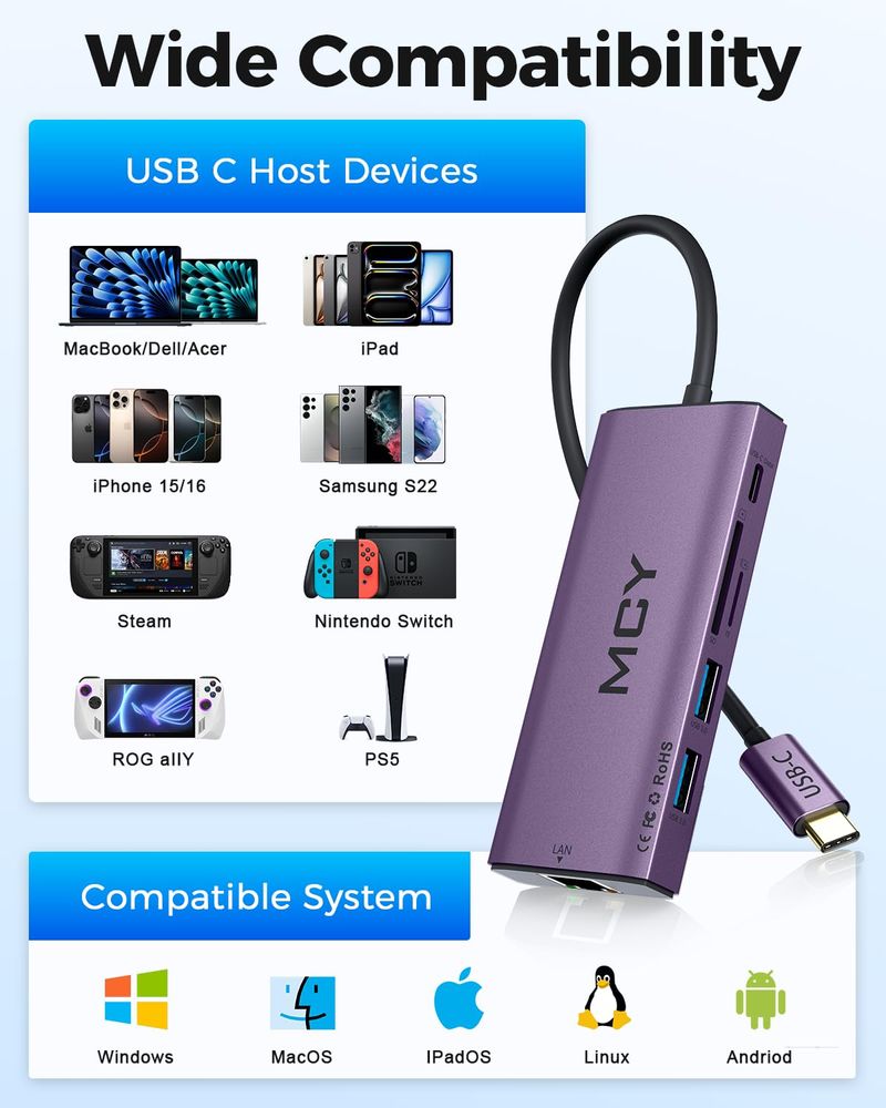 Compatibilidad universal: el concentrador USB para portátil es plug and play, compatible con casi dispositivos USB-C, dispositivos Thunderbolt 34, como MacBook, Asus, Xiaomi, Lenovo, HP, computadoras Razer; Samsung S10S10+, S20, S21, iPhone 15 y 16 series, y teléfonos y tabletas Android que admiten salida de video y datos de interfaz tipo C. Además, la estación de acoplamiento para MacBook es compatible con sistemas WindowsMacOSChromeOSUNIXLINUX.