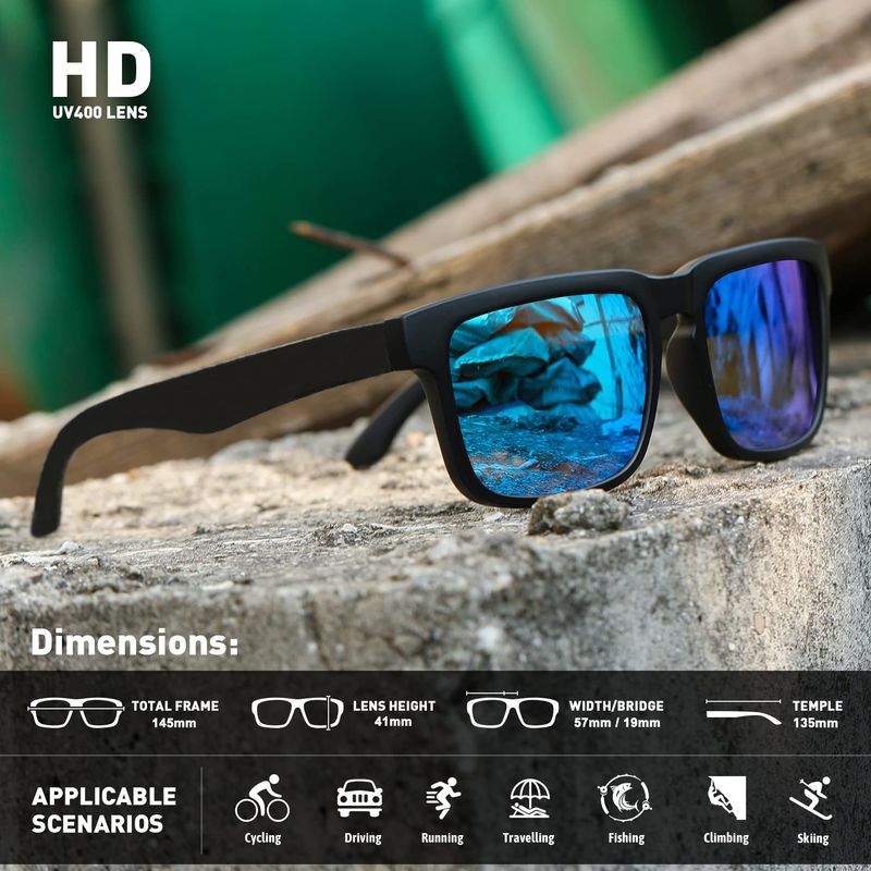 Protección UV400: bloquea los rayos UV, suprime la luz reflejada como superficies de carretera, nieve y océanos, y reduce el deslumbramiento, mientras reproduce fielmente el color original. Al dejar entrar la luz natural, reduce la carga sobre tus ojos. Recomendado para personas a las que les gusta pescar, conducir, andar en bicicleta, correr, senderismo.