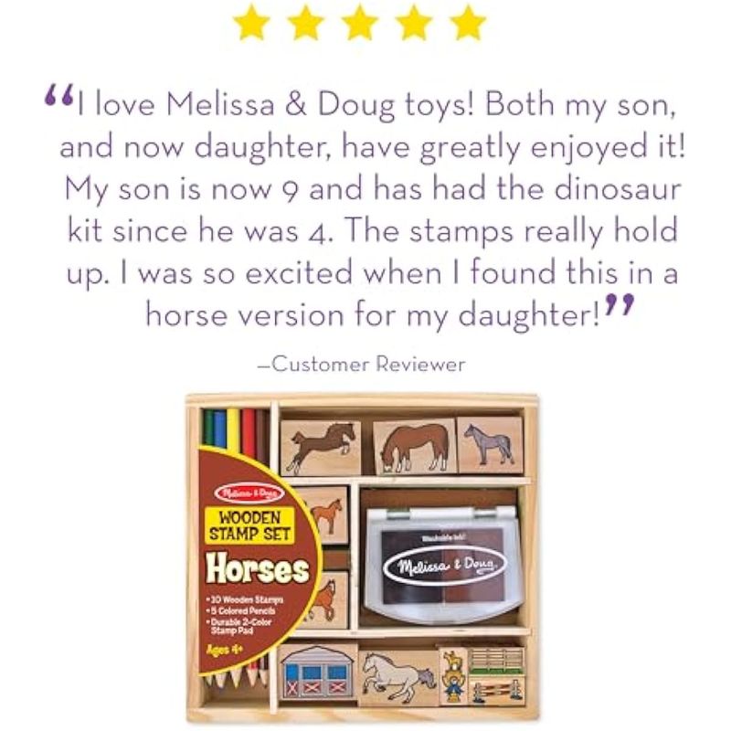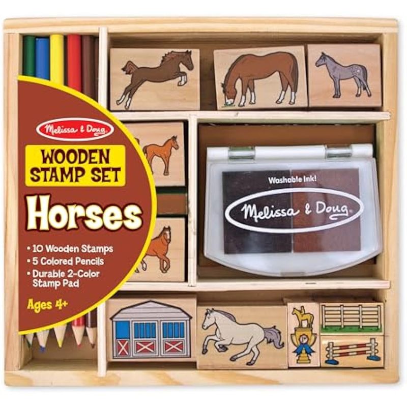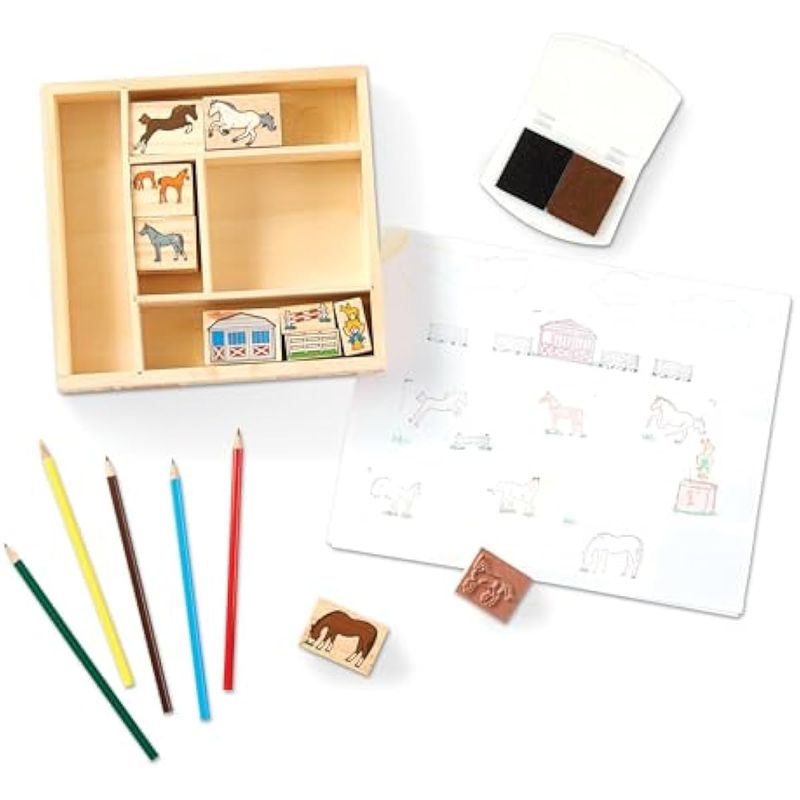 Melissa & Doug Juego de actividades de sellos de madera: establo de caballos, 10 sellos, 5
