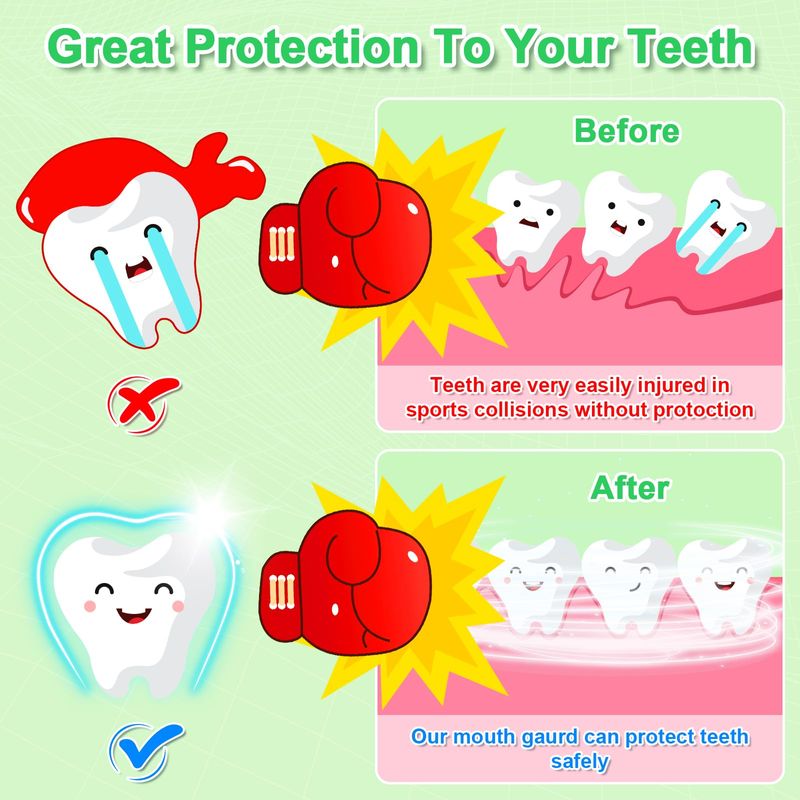 Protección bucal superior: el protector bucal deportivo de doble capa es más grueso que el promedio, y las almohadillas de seguridad adicionales ayudan a absorber el impacto en la parte inferior del protector bucal, lo que proporciona la mejor protección a la boca de los jóvenes durante el deporte.