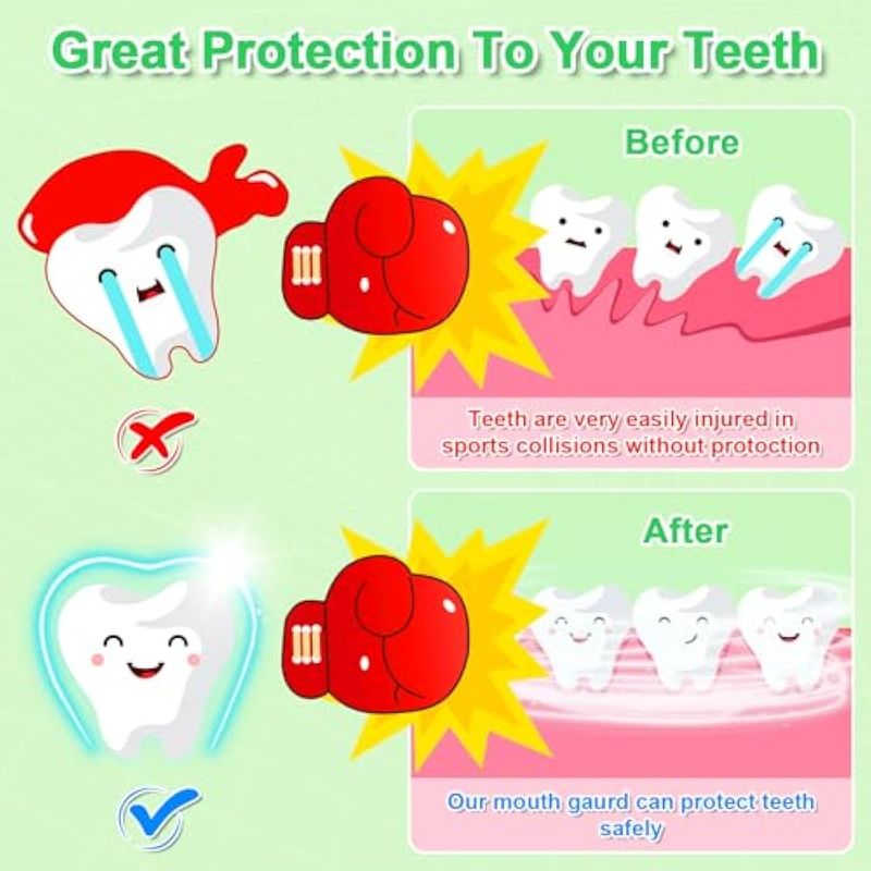 Ajuste perfecto: cada protector juvenil para niños mide 2.0 x 1.7 x 0.7 in2.04 x 1.65 x 0.67 pulgadas, adecuado para edades de entre 8 y 15 años. Es fácil de moldear para que los dientes jóvenes obtengan el ajuste perfecto, hace que sea fácil hablar, respirar y beber sin quitar los guardias.