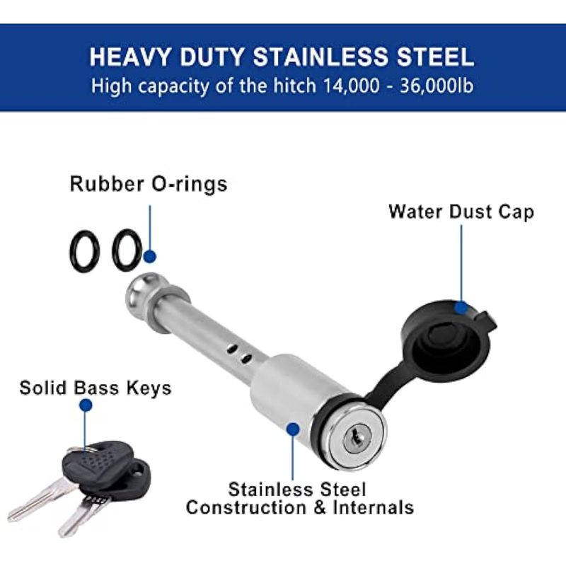 Acero inoxidable resistente: el bloqueo de enganche de remolque resistente está hecho de acero inoxidable para proporcionar la máxima protección contra la corrosión y el óxido. Este bloqueo de enganche está clasificado para la alta capacidad del enganche de 14,000 - 36,000 libras, es lo suficientemente potente para el transporte a largo plazo y protección completa, lo que te permite disfrutar de tu viaje de remolque con un seguro de seguridad.
