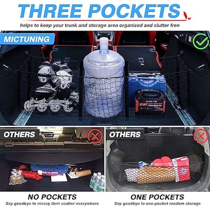 Tres bolsillos: para clasificar y mantener tu carga en su lugar sin volar por todo tu maletero o escotilla. Ayuda a organizar o almacenar alimentos, equipo de automóvil, herramientas y otros artículos, hace que todos los artículos estén seguros sin dañarlos