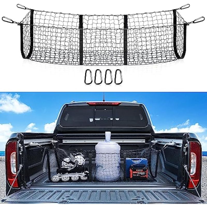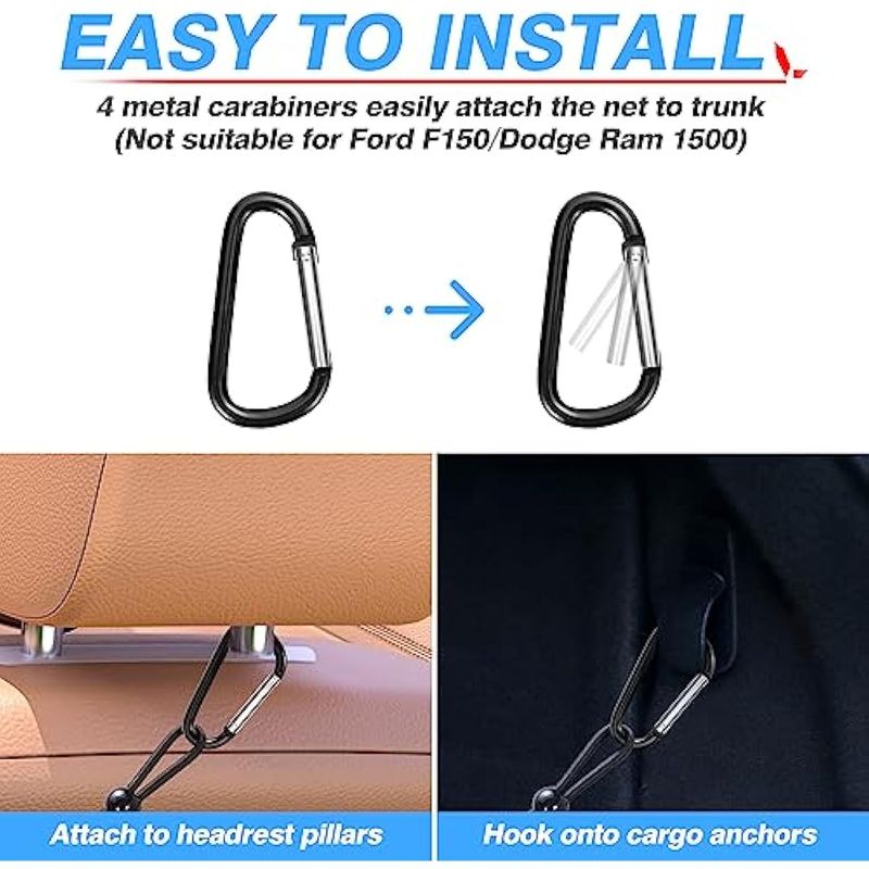 Fácil de montar: viene con cuatro mosquetones de metal adicionales para una fácil instalación, simplemente conecta la red a los postes del reposacabezas o anclajes de amarre de carga que están en tu automóvil. No es compatible con Ford F150 o Dodge Ram 1500