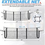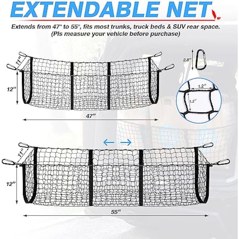 Red de carga expandible: red de malla negra de 47 x 11 x 12 pulgadas expandida a 55 x 11 x 12 pulgadas, por lo que puedes meter aún más cosas que nunca. Se adapta perfectamente a la mayoría de maleteros, camas de camioneta o espacio de carga trasera de SUV. Nota: Por favor, mide la cama de tu camión primero
