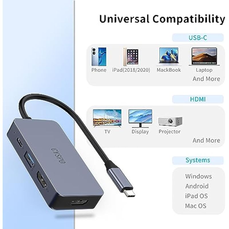 Diseño innovador: el adaptador USB C a HDMI Mini de CYSPO cuenta con una composición innovadora con 2 puertos HDMI 4K HDR, 1 puerto USB-A 3.0 compatible con transferencias de datos de hasta 5 Gbps y 1 puerto de soporte de alimentación USB-C permite una carga rápida de 100 W. Este versátil adaptador Dual HDMI está hecho a medida para cada escenario, ofreciendo un nivel incomparable de comodidad y flexibilidad.