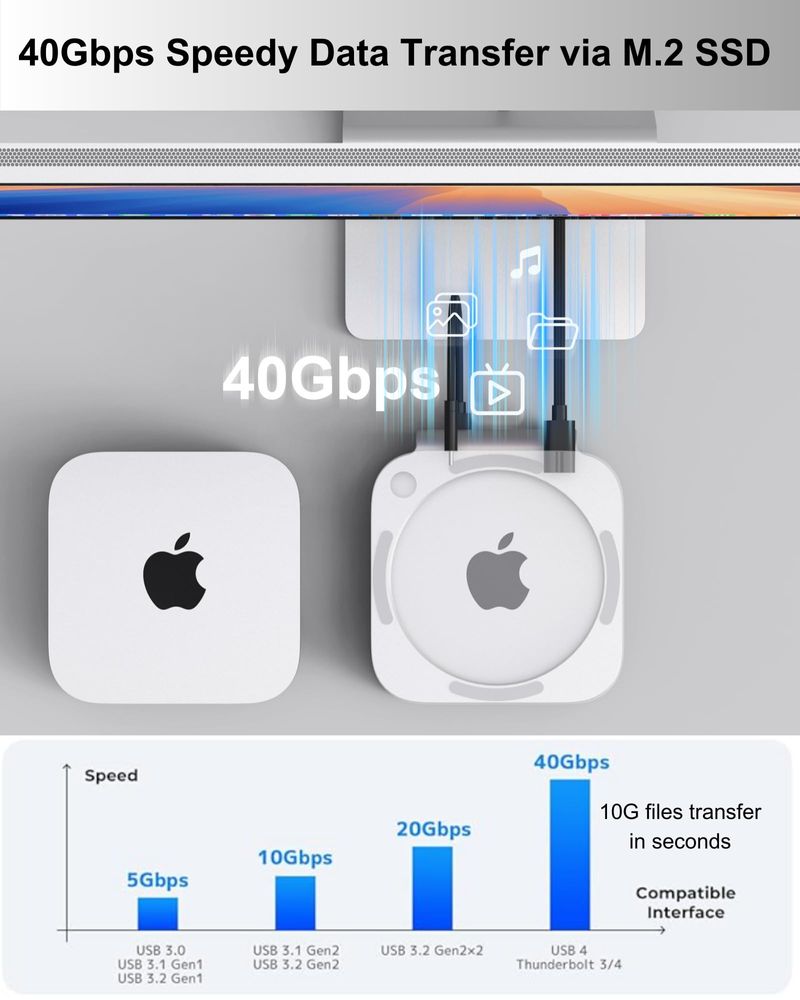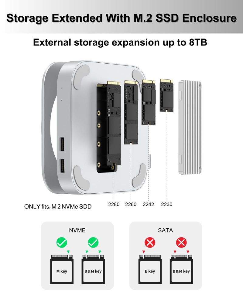 Almacenamiento extendido con carcasa SSD M.2 de 40 Gbps: esta estación de acoplamiento para Mac Mini está equipada con una carcasa de disco duro incorporada, capaz de ejecutar SSD NVMe M.2, soporta hasta 8 TB y la mayoría de tamaños SSD M.2 2230224222602280 con velocidades de 40 Gbps para todos tus archivos y medios. Qué espacio para aumentar fácilmente el almacenamiento de memoria sin agregar desorden a su espacio de trabajo.