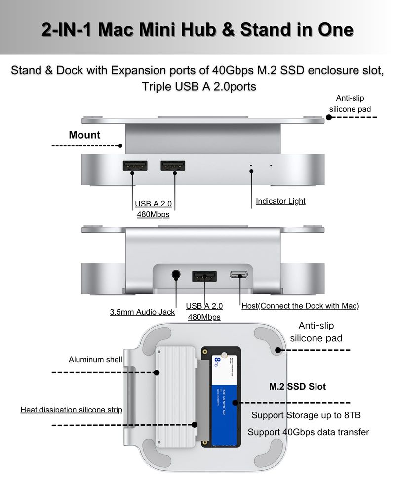 MINI DOCK Y SOPORTE DE ALUMINIO PARA MAC DE 40 GBPS, CONCENTRADOR USB 4 PARA MAC MINI M4 Y M4 PRO 2024 CON CARCASA SSD M.2 NVME DE 40 GBPS, HOST THUNDERBOLT, TRIPLE USB A 2.0, ACCESORIOS DE