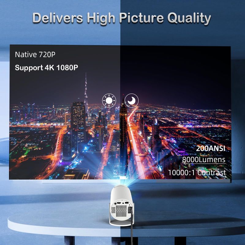 4 & : Este proyector portátil inteligente ofrece una pantalla nativa Full HD 720P y soporte 4K 1080P, produciendo hasta 200 ANSI 8000 lúmenes de brillo. Tiene una relación de contraste de 10.000:1 y cuenta con corrección trapezoidal automática y enfoque manual para una excelente calidad de imagen