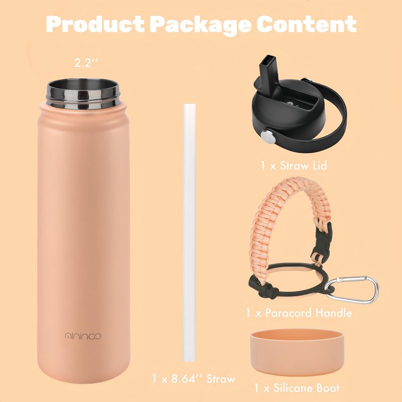Mininoo Botella de agua de 32 onzas con aislamiento al vacío con pajilla, termo de acero inoxidable