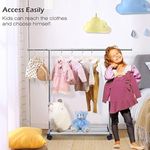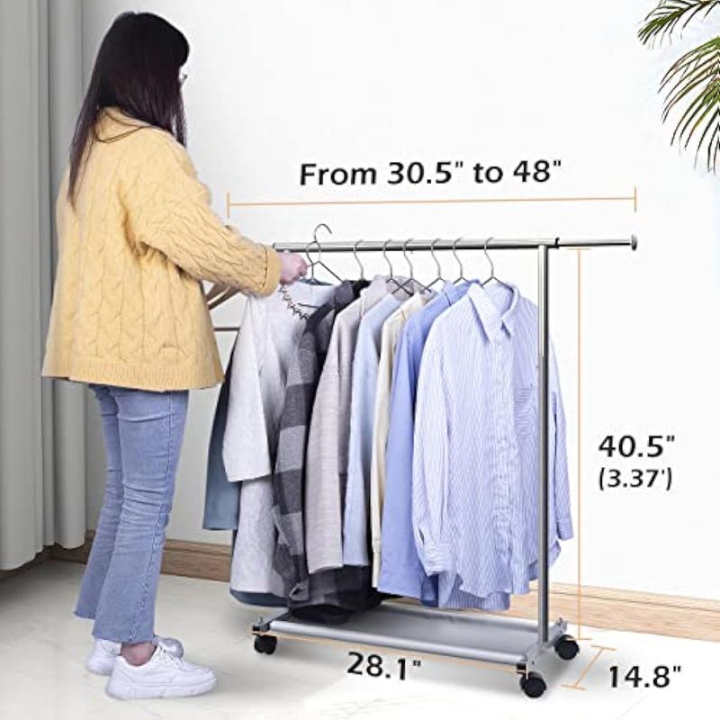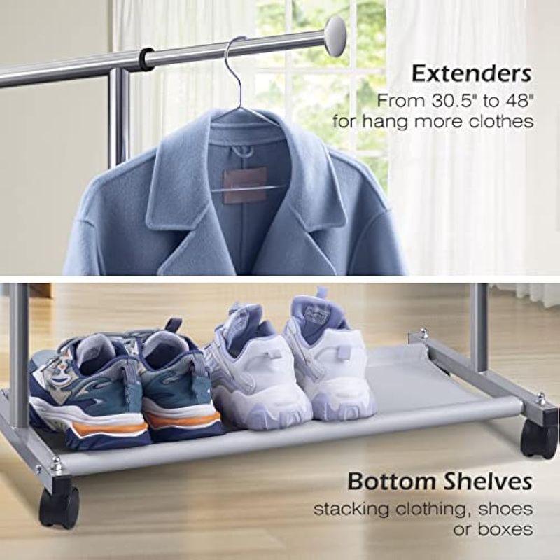 MISSLO Percheros cortos para colgar ropa con estantes inferiores y ruedas, perchero resistente para