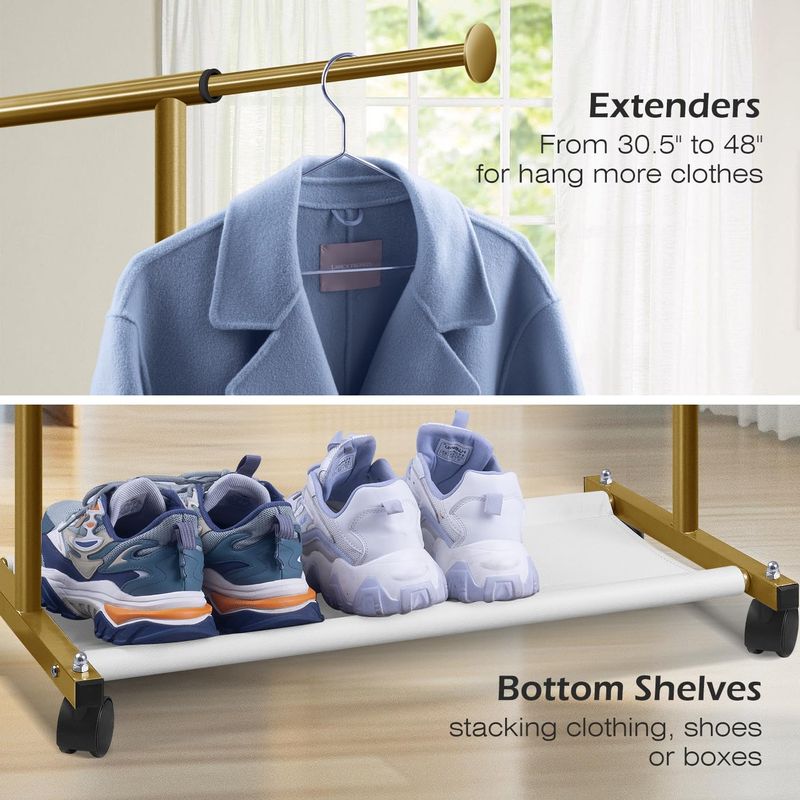 Los estantes inferiores se ajustan a zapatos y extensores en la parte superior ofrecen más espacio: el estante con tela Oxford duradera en la parte inferior para apilar ropa, zapatos o cajas, también evita que la ropa larga se ensucie; en cada extremo puedes extender el estante de armario de 30.5 a 48 pulgadas para colgar más ropa