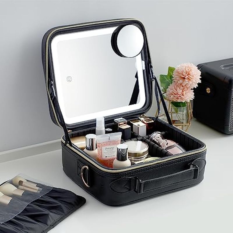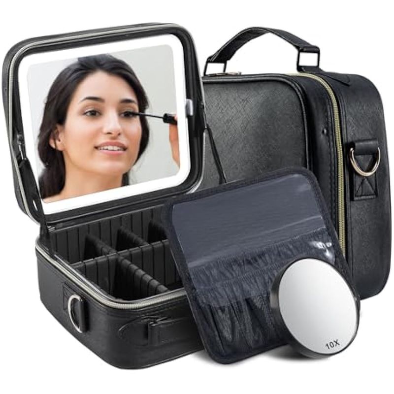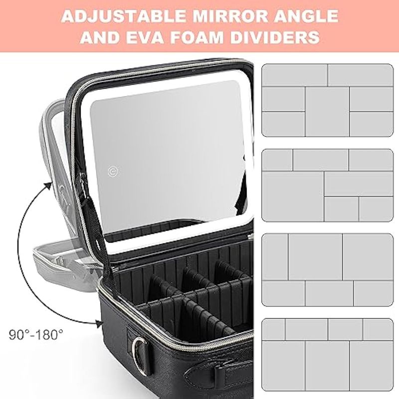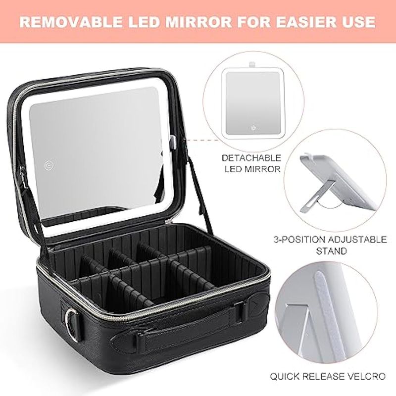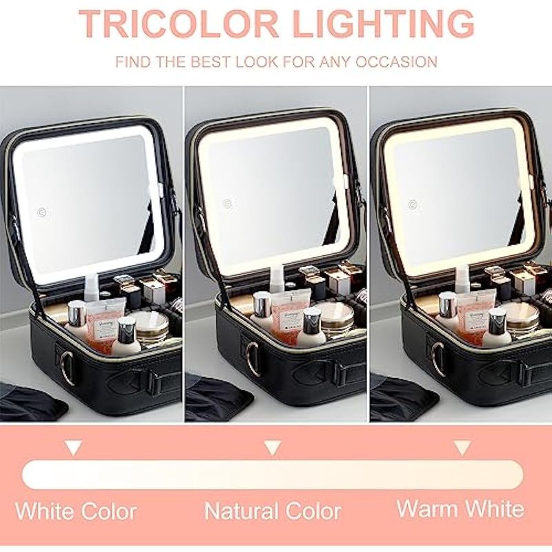 Espejo de brillo extraíble y ajustable: el espejo de maquillaje está firmemente unido a la bolsa de maquillaje con velcro y se puede desmontar para un uso separado, y el espejo de maquillaje viene con un soporte separado que se puede colocar cómodamente en la mesa de acuerdo a tus necesidades. Hay tres modos de iluminación y niveles de brillo que se pueden cambiar. Con una pulsación prolongada en el interruptor, y una pulsación corta puede ajustar la temperatura de color entre luz fría, natural y cálida.