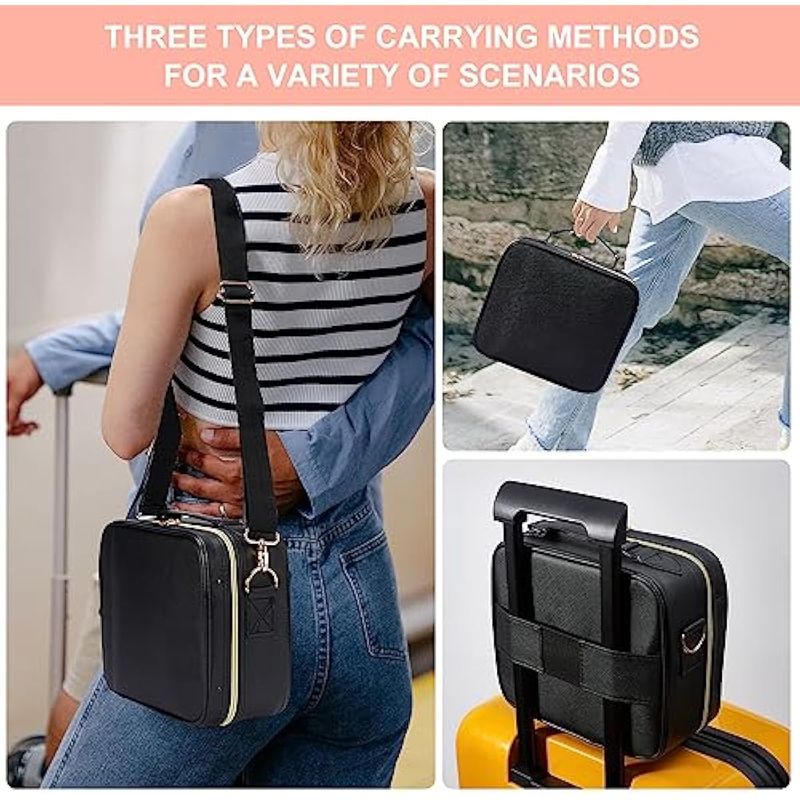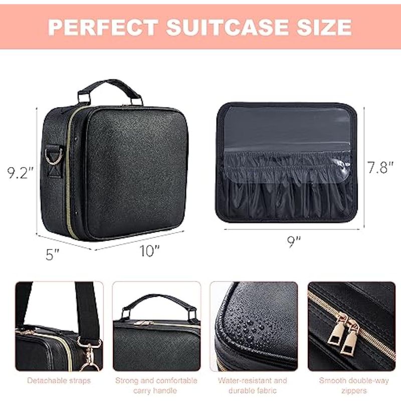 Construcción robusta y sofisticada: la bolsa de maquillaje de viaje está hecha de cuero sintético resistente y duradero, que es impermeable y portátil, resistente al polvo y fácil de limpiar. También es ecológico e inodoro. El sistema de cremallera está hecho con un alto estándar y se puede abrir y cerrar fácilmente con una mano para un tirón más suave. El mango ergonómico y la correa de equipaje ubicados en la parte posterior de la bolsa pueden liberar tus manos, y la correa extraíble puede responder de manera flexible a varias ocasiones.