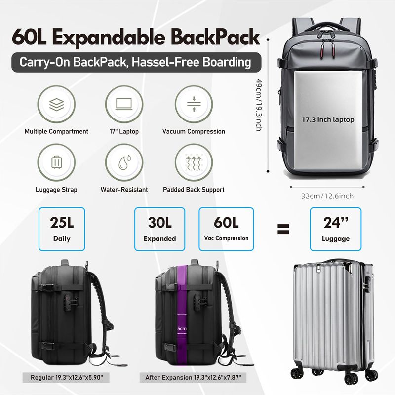 Capacidad equivalente a una maleta de 24 pulgadas: la mochila de viaje al vacío se puede expandir de 25 litros a 60 L, ofreciendo espacio adicional para un viaje de negocios de una semana, escapada de fin de semana o equipo de senderismotrekking