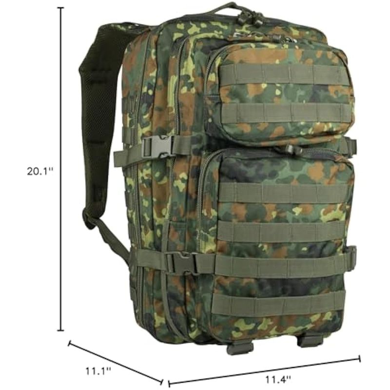 Funcionalidad táctica: fiel a su diseño de inspiración militar, el paquete de asalto Mil-Tec incorpora varias características tácticas; los bucles MOLLE en el exterior permiten una fijación personalizable de bolsas o equipo adicionales; las correas de compresión en los lados ayudan a controlar el volumen y asegurar tu carga, mientras que los ojales proporcionan puntos de anclaje para equipo adicional; el asa de transporte resistente ofrece una opción de transporte alternativa
