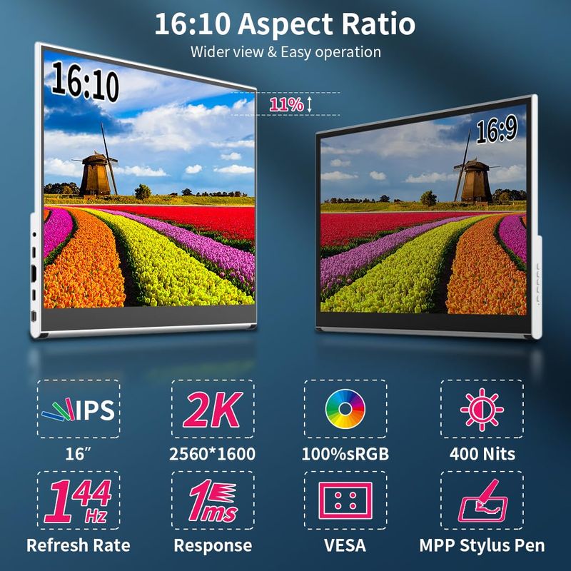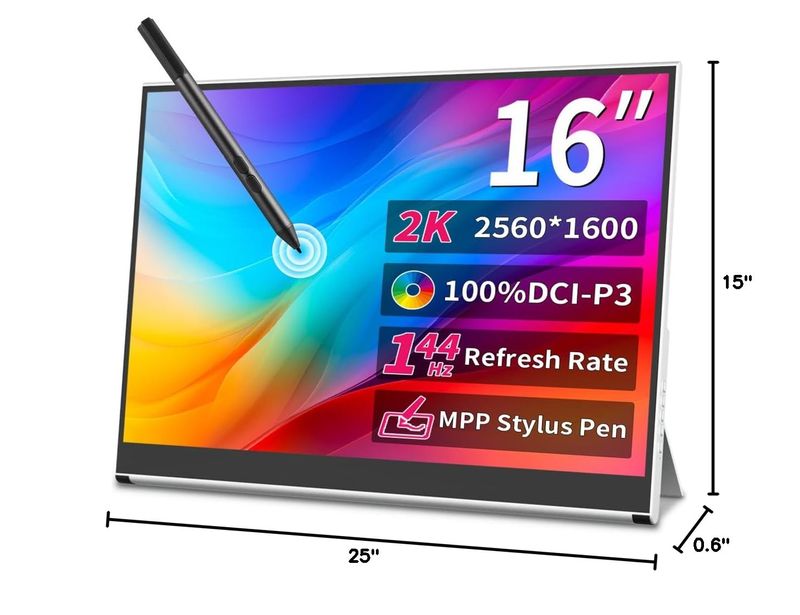 Monitor portátil de 16 pulgadas 2K con pantalla táctil, monitor de juegos de 144 Hz, soporte para