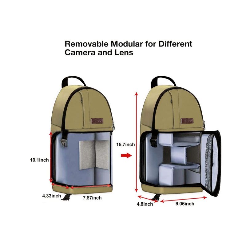 The soft foam layer surrounded can well protect your camera and accessories from accidental shocks and scratches. Separated to 2 parts: the larger lower storage case inner dimension: 10.1 x 7.87 x 4.33 inch is separated with removable modular inserts to fit various lenses and flash units; upper parts for needed accessories. Tripod holder is featured on one side. 1 hidden anti-theft zippered pocket on the back for your precious items.