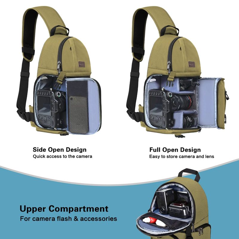 Dimension: 15.7 x 9.06 x 4.8 inches L x W x H. This durable camera bag contains several compartments for camera, phone, accessories and personal belongings. One chest bag is with large capacity for your travel and outgoing.