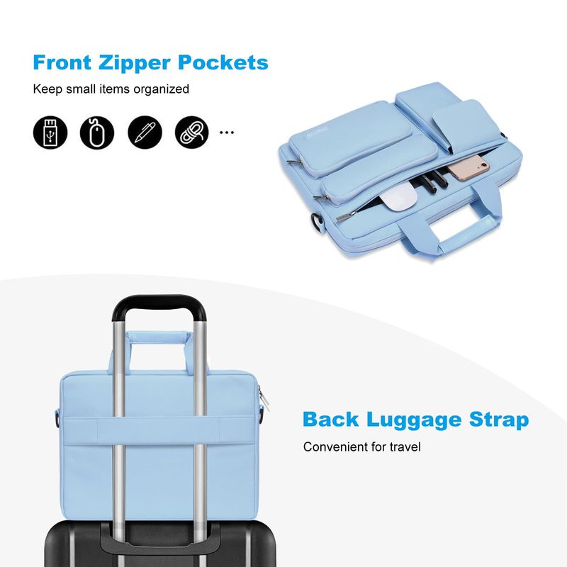 El compartimento interior principal sostiene tu laptop y otras cosas importantes. 2 bolsillos elevados, 1 solapa y 1 bolsillo horizontal son prácticos para un acceso rápido y almacenar el teléfono celular, ranuras para bolígrafos, cartera, llaves y otros objetos pequeños. Bolso bandolera multifuncional con diseño de 4 bolsillos delanteros para portátil que te permite llevar tu computadora portátilportátilultrabook en un estilo único y elegante.