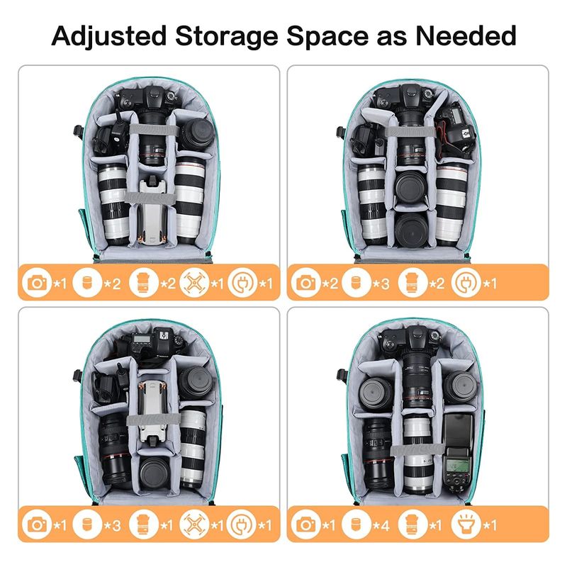 Diseño totalmente abierto. Tiene 2 bolsillos para accesorios en la cara posterior para almacenar cables, tarjetas SD, batería externa portátil y otros objetos pequeños. El soporte de trípodemonopie cuenta con 1 correa segura en un lado de la bolsa. 1 bolsillo en el otro lado puede almacenar paraguas o una botella de agua hasta un diámetro máximo de 2.5 pulgadas. 1 bolsillo antirrobo está diseñado en la parte posterior para tu cartera, teléfono celular y artículos preciados.