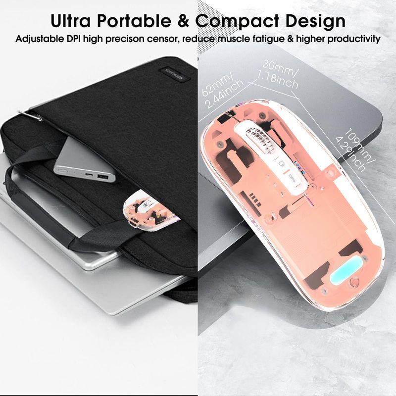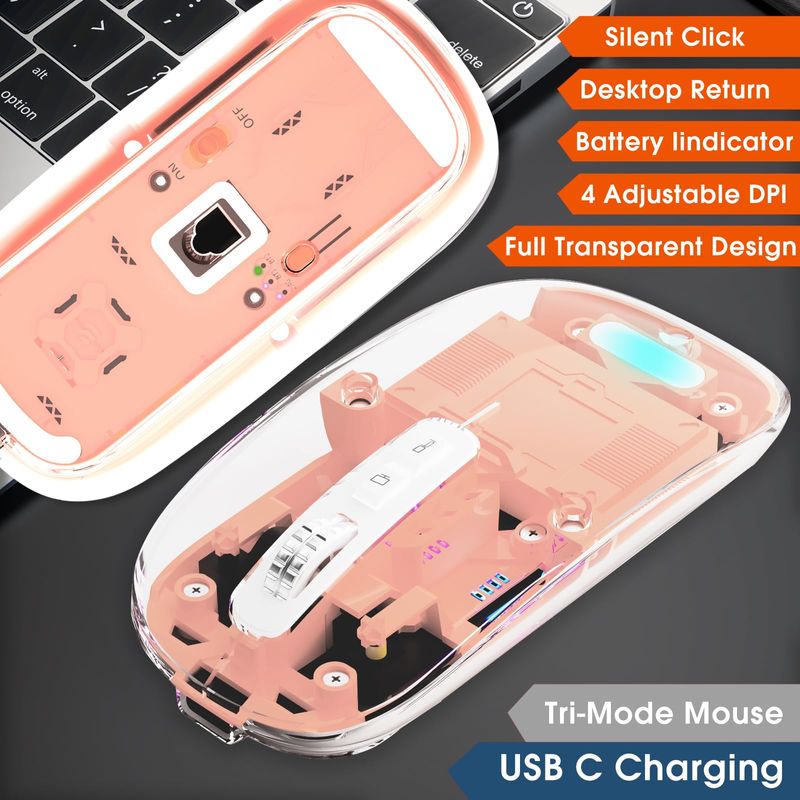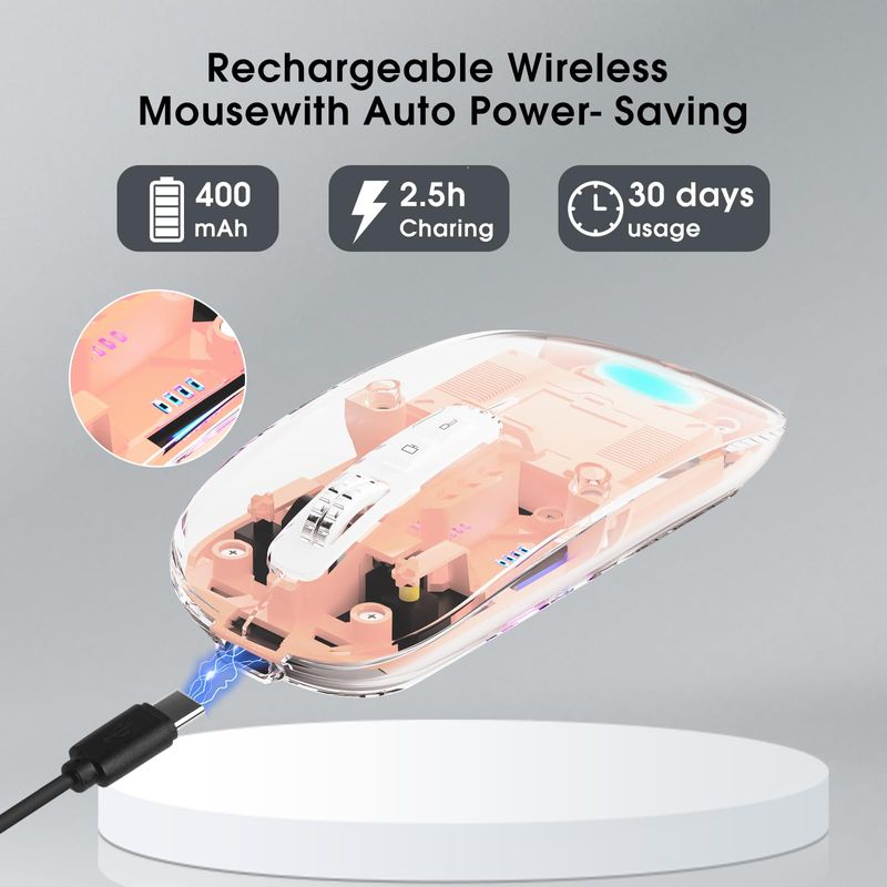 Mouse inalámbrico transparente para computadora, mouse Bluetooth recargable, pantalla de