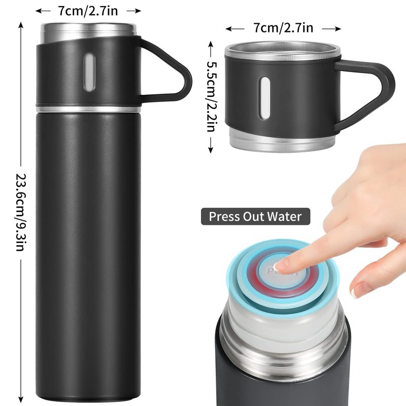 A prueba de fugas y duradero: los termos calientes con taza utilizan material de alta tecnología que puede proteger la botella de caídas y deformaciones, la tapa de presión con el anillo de silicona y fija la tapa de la taza puede proteger el agua que se derrama.