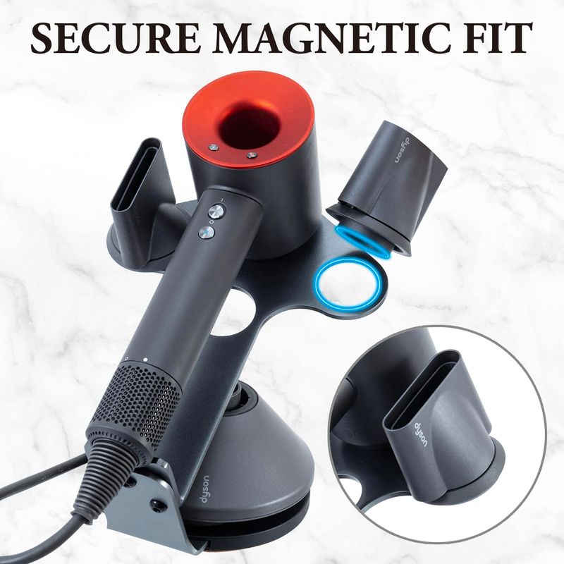 El muelle independiente tiene una parte inferior de corcho antideslizante para una colocación segura en una encimera de baño, tocador o vestidor. **Diseñado para sostener secadores de pelo Dyson y tamaños compatibles, comprueba las dimensiones de los anillos magnéticos y la funda