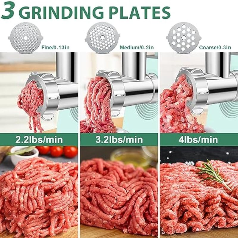 Amplia aplicación: la picadora de carne viene con 3 placas de molienda de diferentes tamaños para satisfacer sus necesidades fino0.13 pulgadas, mediano0.2 pulgadas, grueso0.3 pulgadas, 1 relleno de salchichas de acero inoxidable, 1 máquina de hamburguesas de prensa, 1 juego de kit de kubbe. Puede satisfacer la mayoría de tus necesidades, como moler carne de res, cerdo, pollo, venado, pato, y para hacer albóndigas, pastel de carne, kubbe, salsa de carne, salchichas, pizza, hamburguesas, etc.