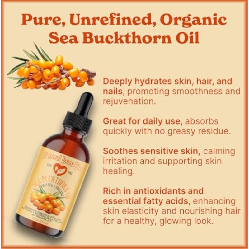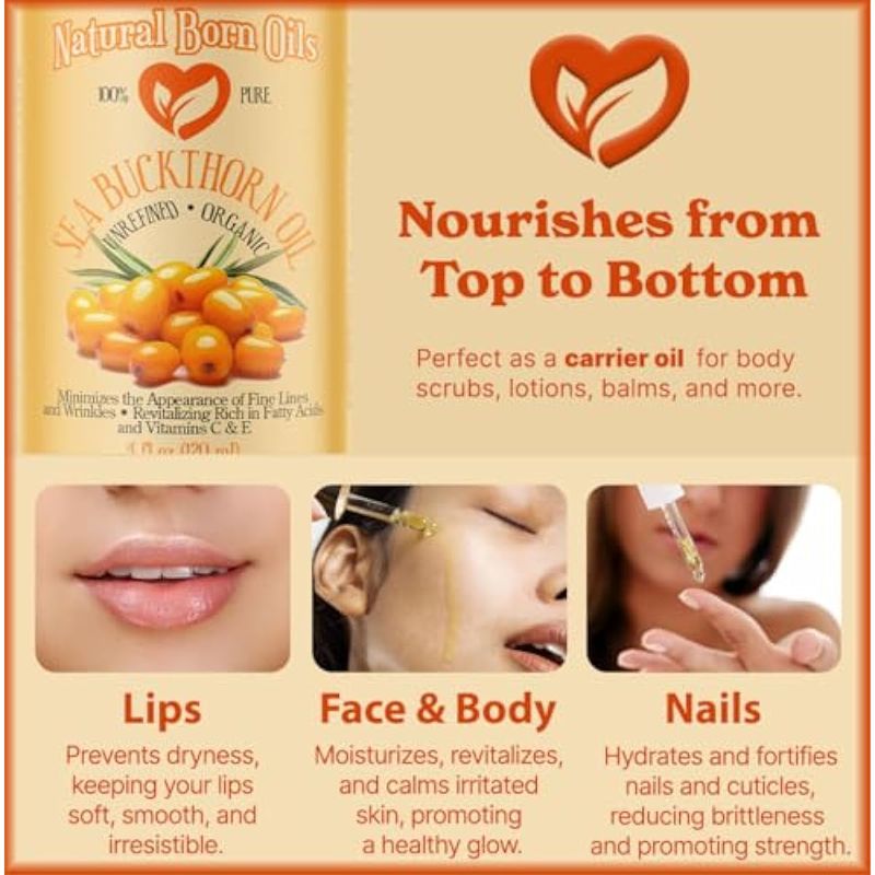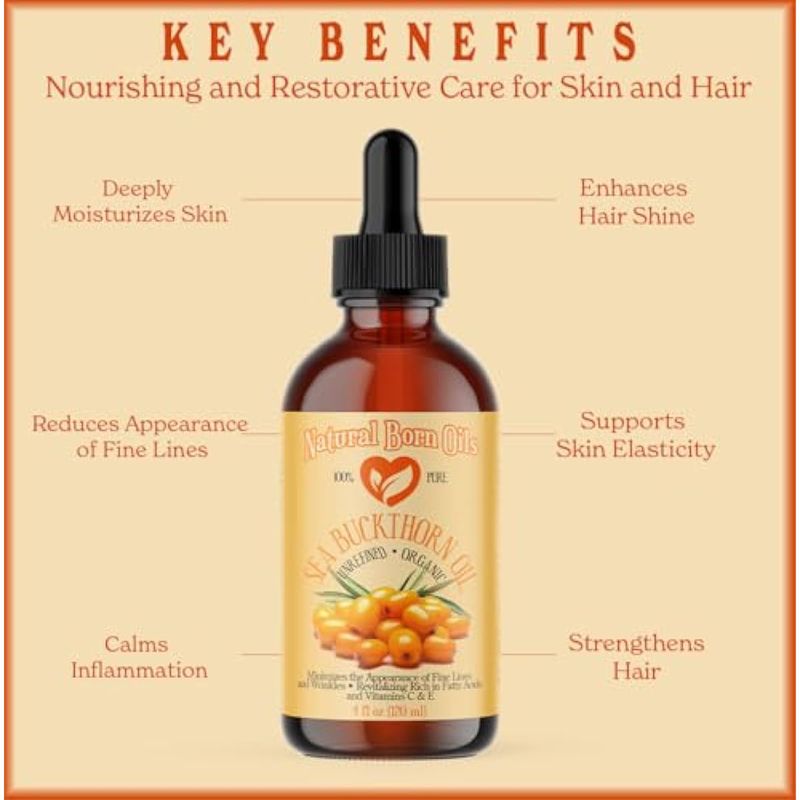 NATURAL BORN OILS ACEITE DE ESPINO AMARILLO DE 4 ONZAS, 100% PURO Y NATURAL, ORGáNICO, PRENSADO EN FRíO, SIN REFINAR, REVITALIZANTE, INCLUYE BOMBA Y CUENTAGOTAS