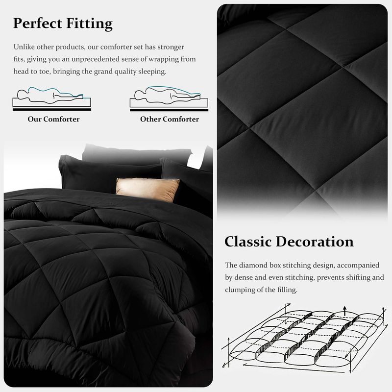 Lo que obtienes: todo lo que quieres en una bolsa. El juego de cama blanca Newspin en una bolsa tiene 4 tamaños disponibles. El juego de edredón tamaño King incluye: edredón: 104 x 90 pulgadas, sábana bajera: 78 x 80 pulgadas, sábana encimera: 108 x 102 pulgadas, 2 fundas de almohada: 20 x 40 pulgadas, 2 fundas de almohada: 20 x 36 pulgadas. Dado que nuestro juego de edredón King viene en un embalaje sellado al vacío, se recomienda secarlo a baja temperatura o colgar el juego de cama al sol y golpearlo suavemente para una mayor esponjosidad.