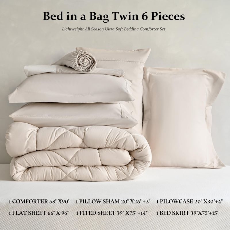 Lo que obtienes: todo lo que quieres en una bolsa. El juego de cama blanca Newspin en una bolsa tiene 4 tamaños disponibles. El juego de edredón tamaño King incluye: edredón: 104 x 90 pulgadas, sábana bajera: 78 x 80 pulgadas, sábana encimera: 108 x 102 pulgadas, 2 fundas de almohada: 20 x 40 pulgadas, 2 fundas de almohada: 20 x 36 pulgadas. Dado que nuestro juego de edredón King viene en un embalaje sellado al vacío, se recomienda secarlo a baja temperatura o colgar el juego de cama al sol y golpearlo suavemente para una mayor esponjosidad.