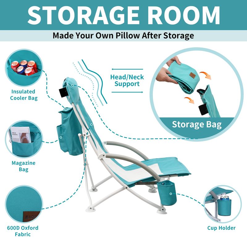 Bolsa térmica aislada y paraguas abatible: todas las sillas están equipadas con una bolsa de refrigeración y un paraguas. Puedes almacenar fácilmente tu bebida y comida con hielo mientras disfrutas del sol y la brisa marina. Mientras el sol se mueve, puedes ajustar la dirección de la sombrilla para disfrutar de tu día en cualquier momento.