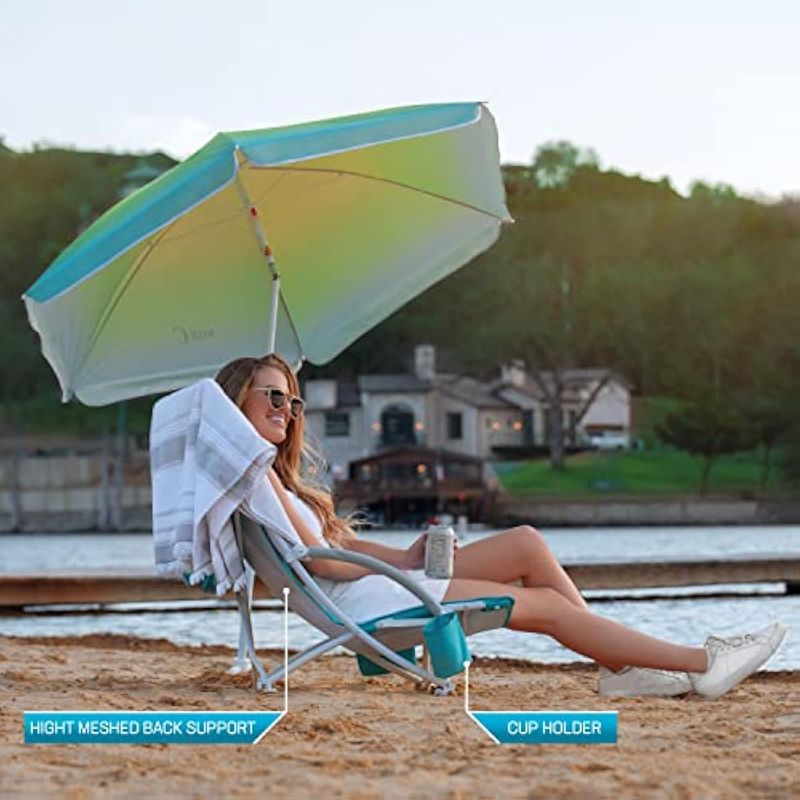 Bolsa térmica aislada y paraguas abatible: todas las sillas están equipadas con una bolsa de refrigeración y un paraguas. Puedes almacenar fácilmente tu bebida y comida con hielo mientras disfrutas del sol y la brisa marina. Mientras el sol se mueve, puedes ajustar la dirección de la sombrilla para disfrutar de tu día en cualquier momento.