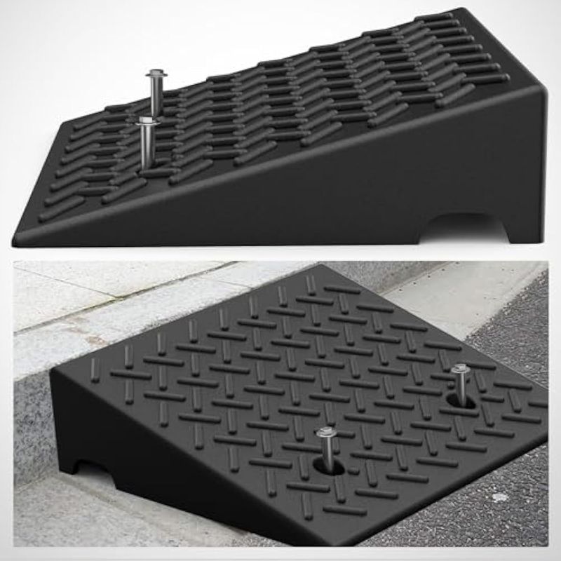 Superficie antideslizante: La rampa de goma presenta un patrón texturizado en la superficie que aumenta la tracción, reduciendo resbalones y caídas incluso en condiciones húmedas. El diseño único hace que sea ideal para usar con sillas de ruedas, scooters y otros vehículos