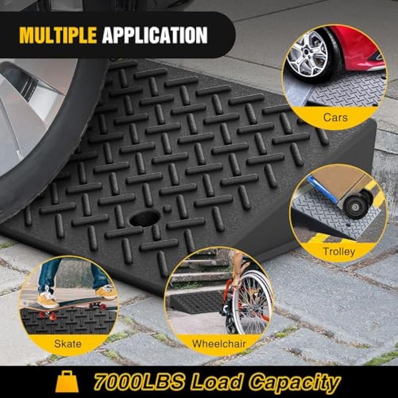 Material resistente: construido con caucho industrial, capacidad de carga de peso de rampas de coche de hasta 7000 libras. Este material duradero está hecho para soportar el uso a largo plazo en todas las condiciones climáticas