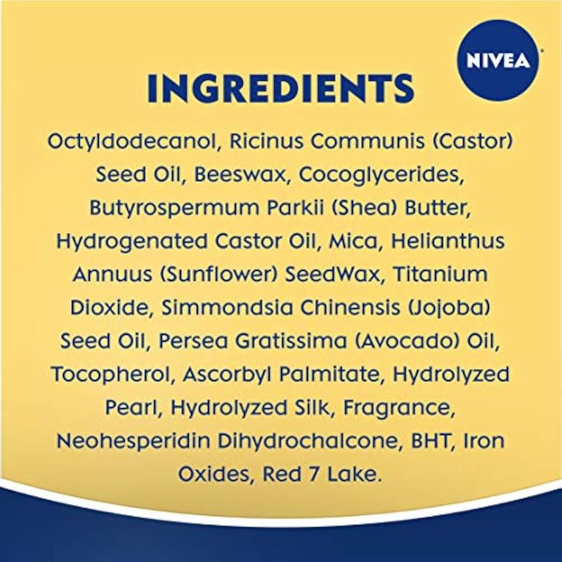 Manteca de karité y aceite de jojoba enriquecido: NIVEA Shimmer Lip Care, bálsamo labial sin aceite mineral está enriquecido con extractos de perlas, manteca de karité y aceite de jojoba