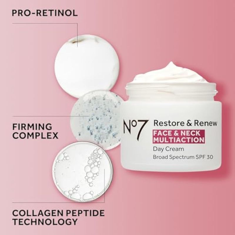 NO7 RESTORE & RENEW MULTI ACTION FACE & NECK SPF 30 DAY CREAM - CREMA HIDRATANTE FACIAL REAFIRMANTE E HIDRATANTE CON áCIDO HIALURóNICO PARA AYUDAR A REDUCIR VISIBLEMENTE LA APARIENCIA DE ARRUGAS (1.69