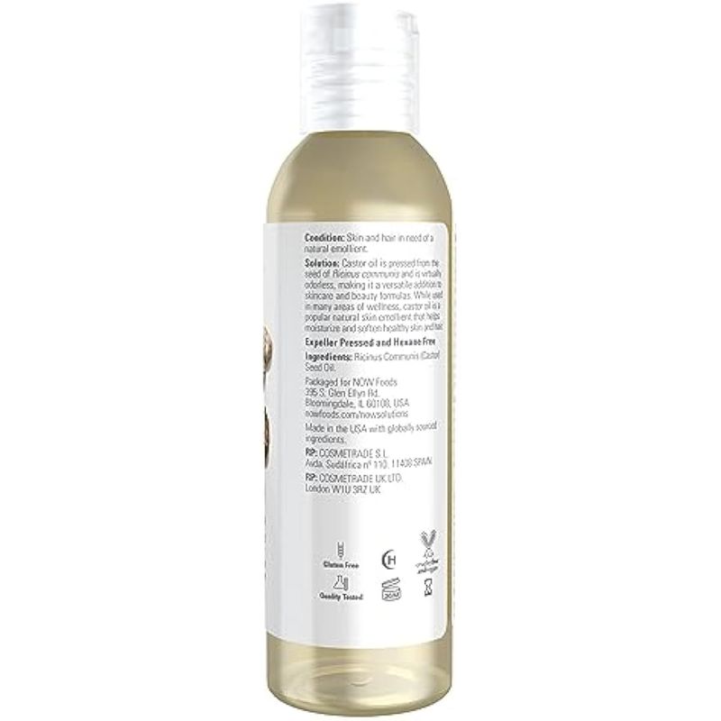 NOW FOODS SOLUTIONS, ACEITE DE RICINO, 100% PURO Y VERSáTIL CUIDADO DE LA PIEL, SUAVIZANTE MULTIUSOS PARA LA PIEL, 4 ONZAS