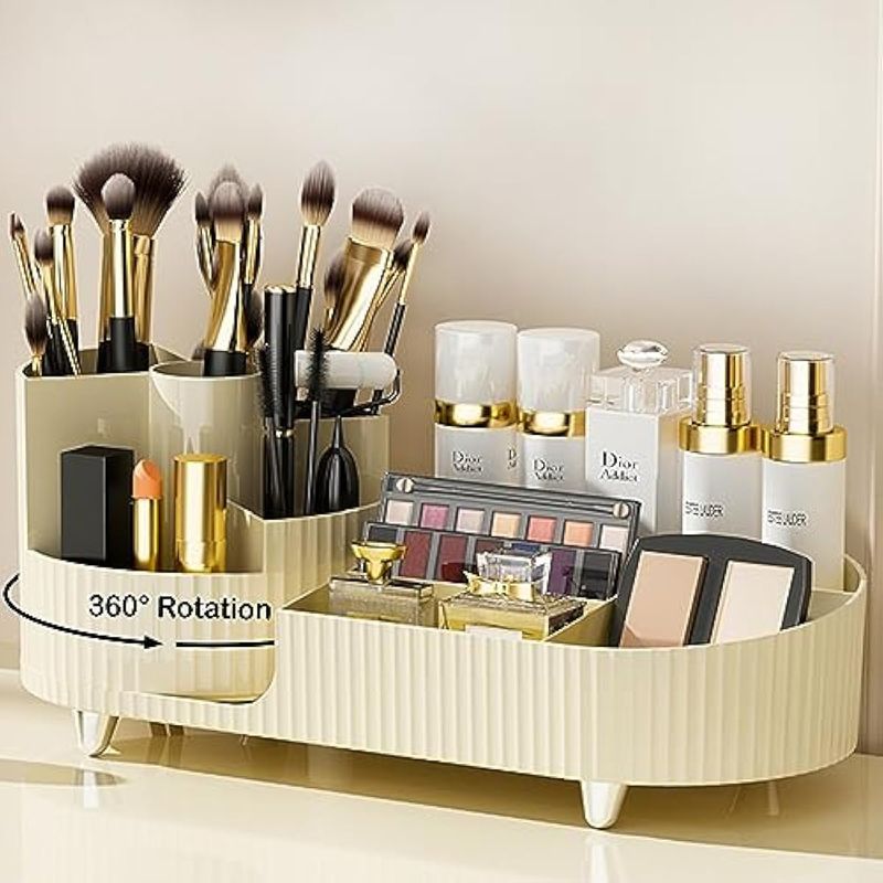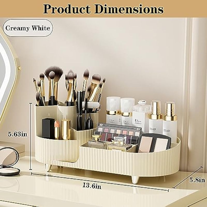 Diseño multifuncional: el último diseño de la gran encimera de almacenamiento de cosméticos se divide en dos áreas, el lado izquierdo del soporte giratorio de 360º para bolígrafos de almacenamiento, el lado derecho de la separación de la caja de almacenamiento de cosméticos, la combinación perfecta puede permitirte que todos los accesorios de maquillaje estén perfectamente almacenados. deja que el cajón y la cómoda digan adiós al desorden