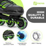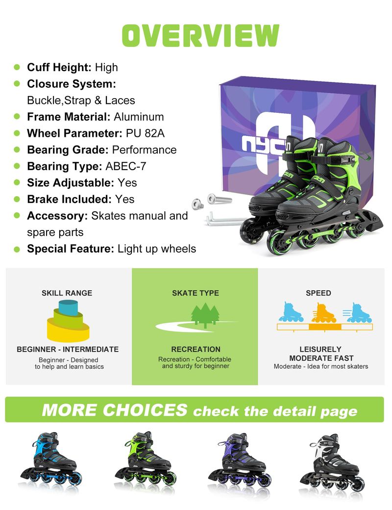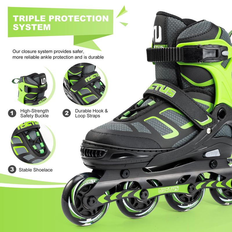 Duradero y suave: el marco del patín en línea NYCTUS está hecho de aleación de aluminio reforzado. Con ruedas de poliuretano 82A de alto rebote y rodamientos ABEC-13 silenciosos de alta velocidad, puedes disfrutar de un patinaje suave, silencioso y cómodo.