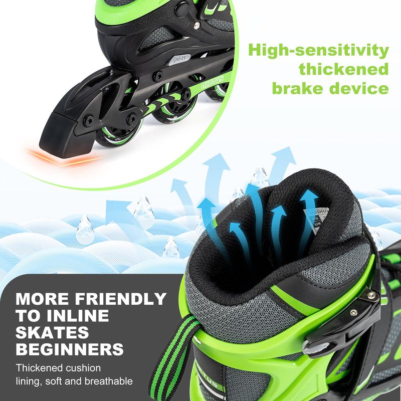 Protecciones de seguridad: nuestros patines en línea para niños y adultos tienen un sistema de triple protección, incluyendo hebilla de trinquete de seguridad, correa de alimentación y cierre de cordones. El freno en el lado derecho de los patines te ayuda a detenerte cuando lo necesites y evita colisiones con otros patinadores.