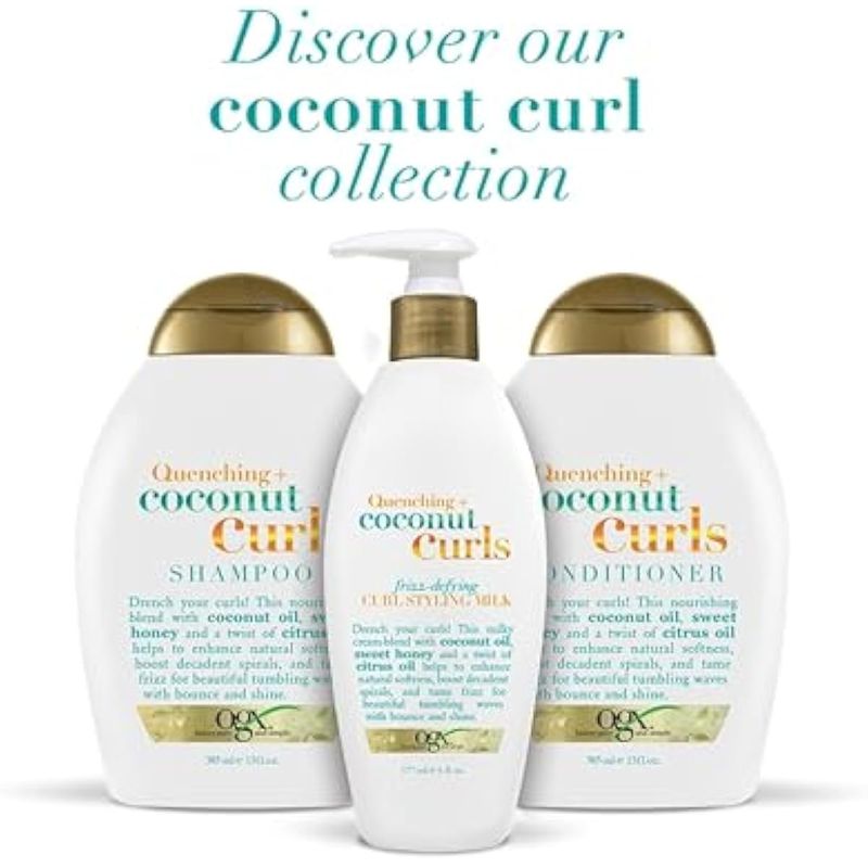 OGX QUENCHING + COCONUT CURLS - LECHE DE PEINADO QUE DESAFíA EL ENCRESPAMIENTO, TRATAMIENTO NUTRITIVO SIN ENJUAGUE CON COCO, ACEITE CíTRICO Y MIEL, SIN PARABENOS Y SULFATOS, 6 ONZAS LíQUIDAS