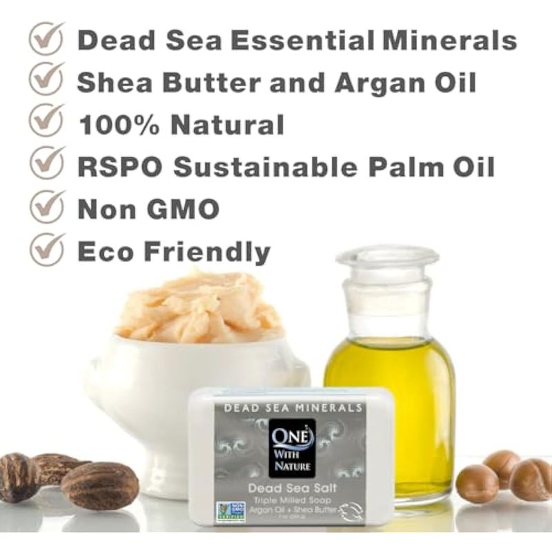 One With Nature Jabón de sal del Mar Muerto de 4 onzas con aceite de argán y manteca de karité, sal